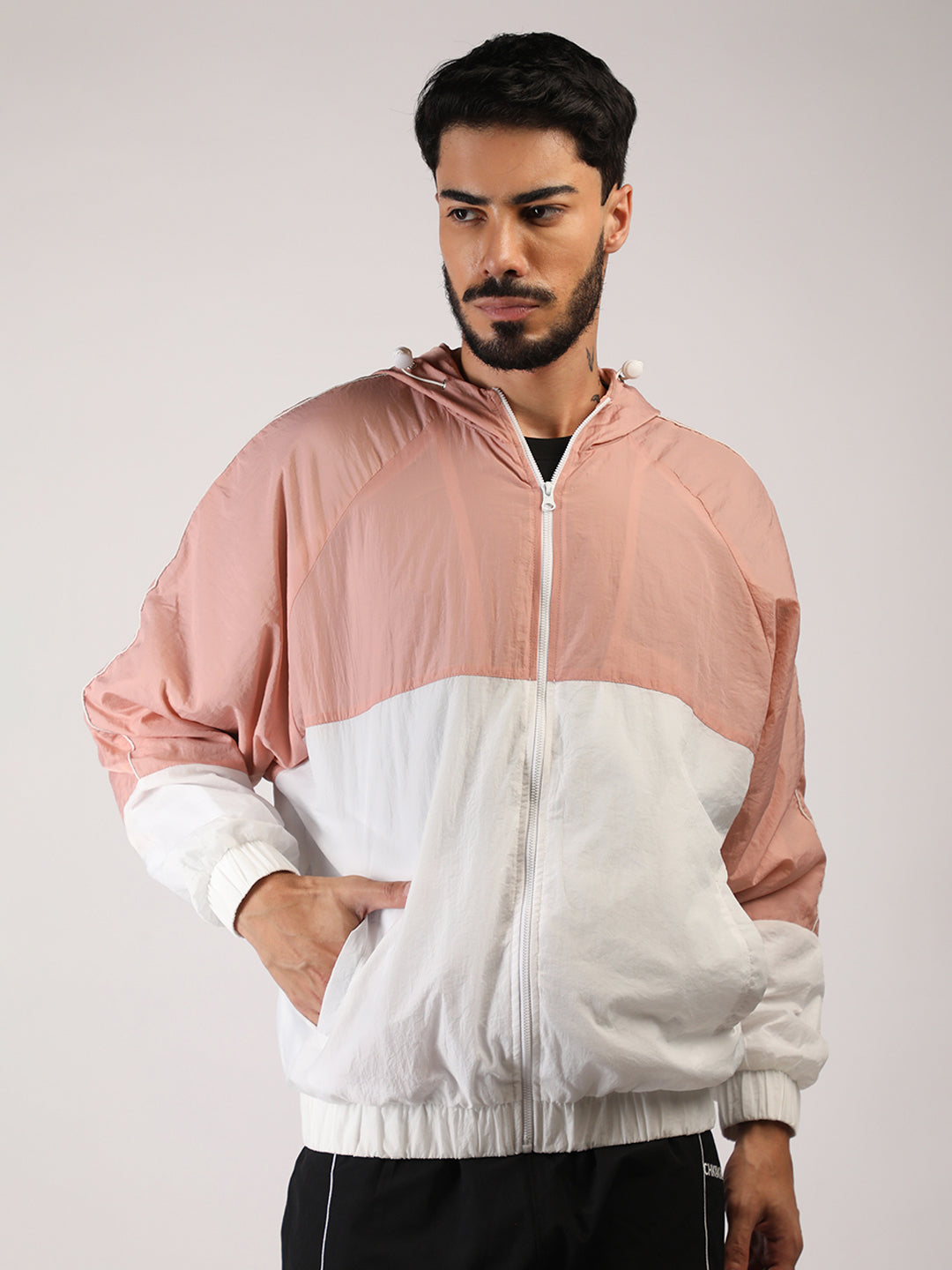 Men Hooded Windcheater Oversized Sports Jacket Peach White