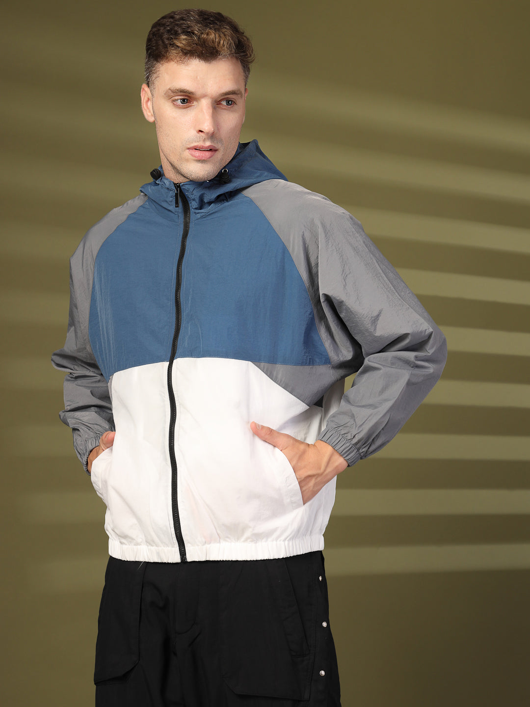 Men Blue White Grey Hooded Windcheater Oversized Sports Jacket