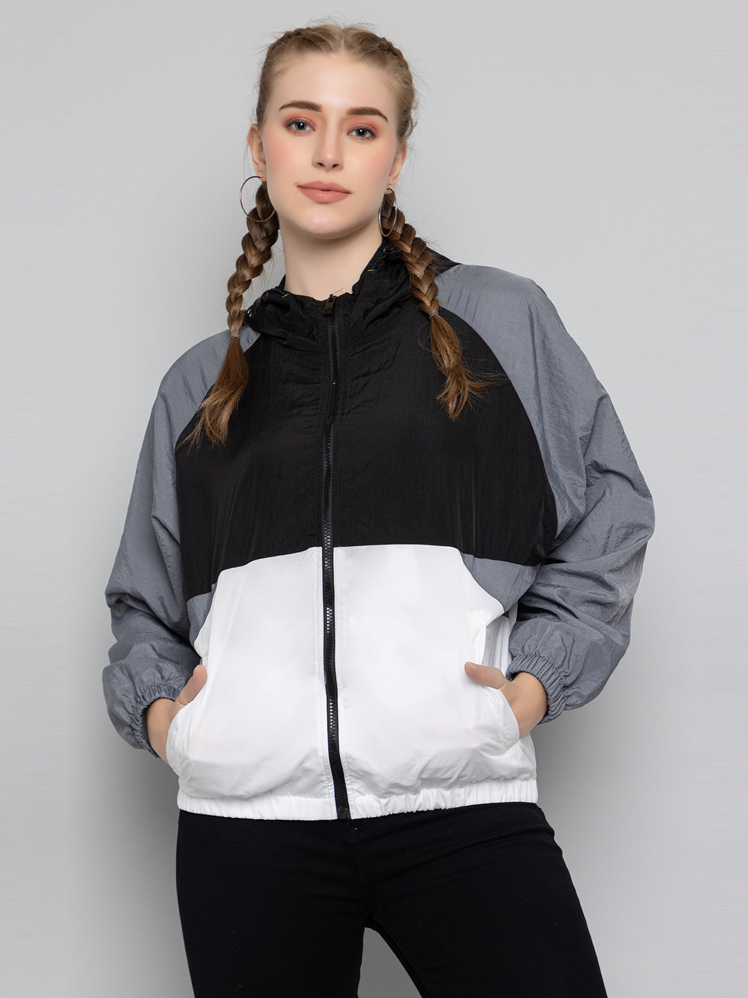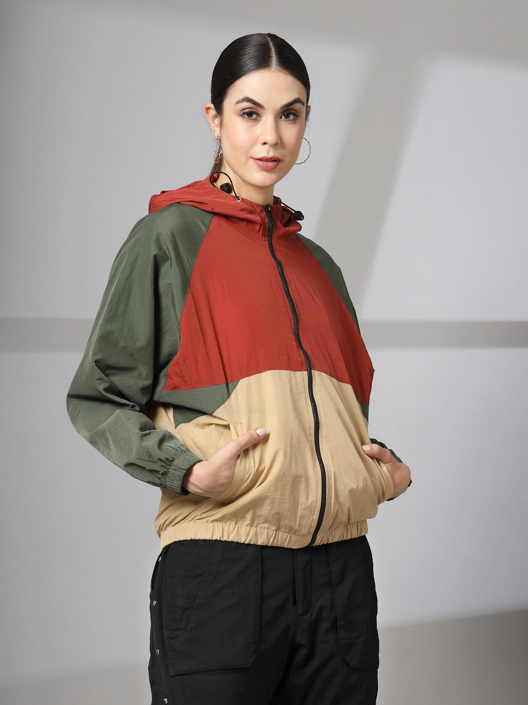 Women Colourblocked Hooded Windcheater Oversized Sports Jacket