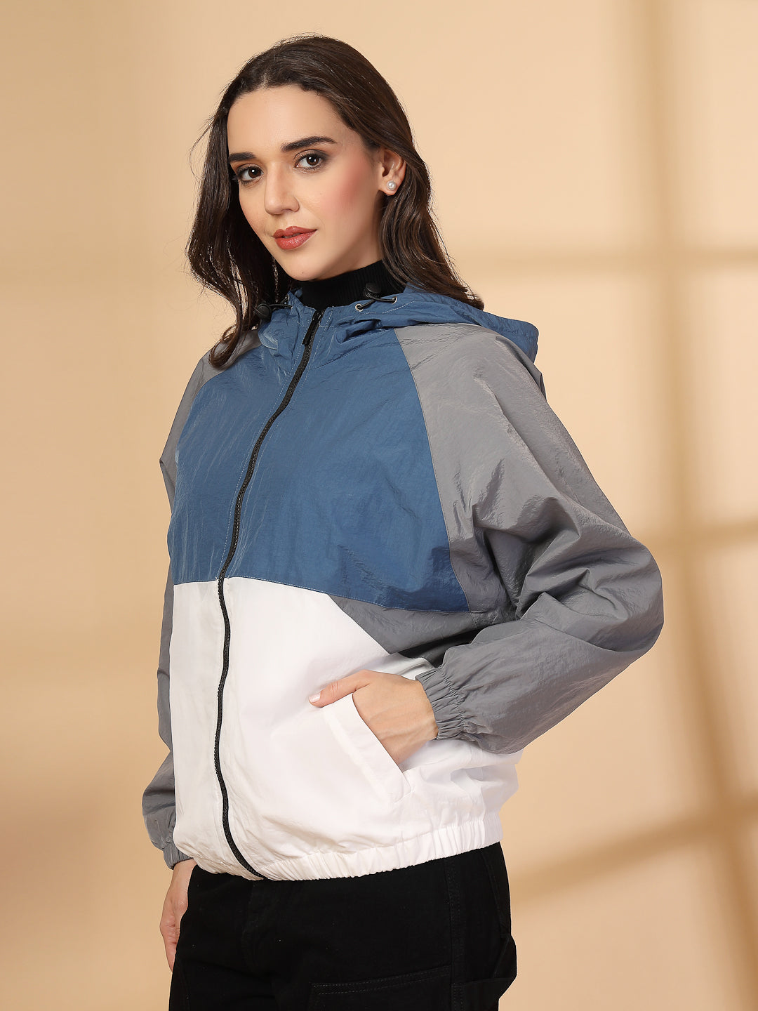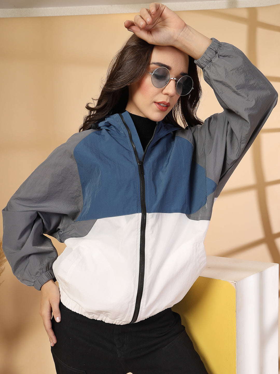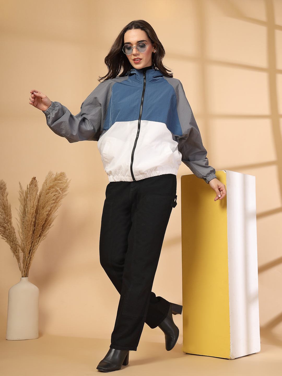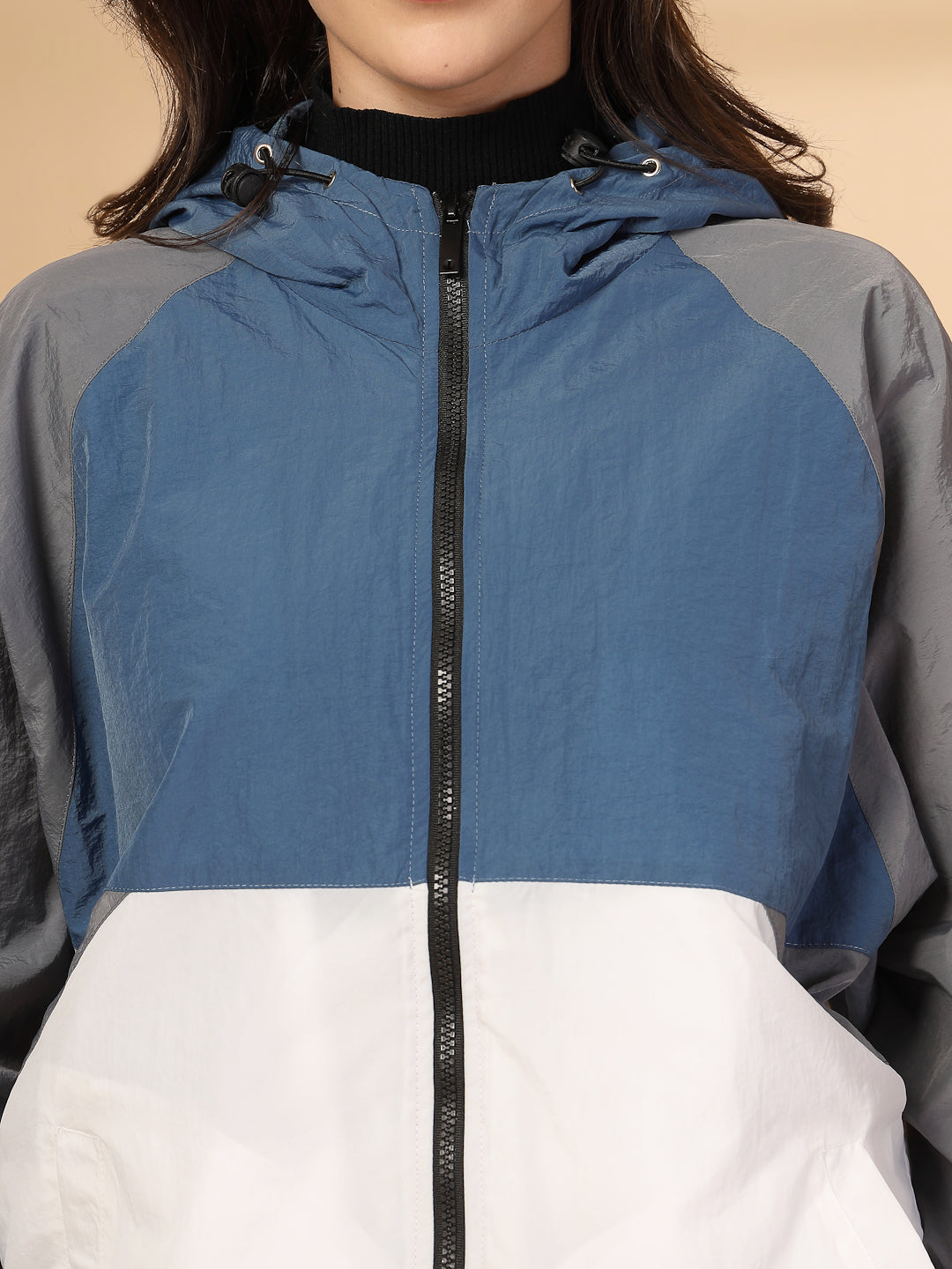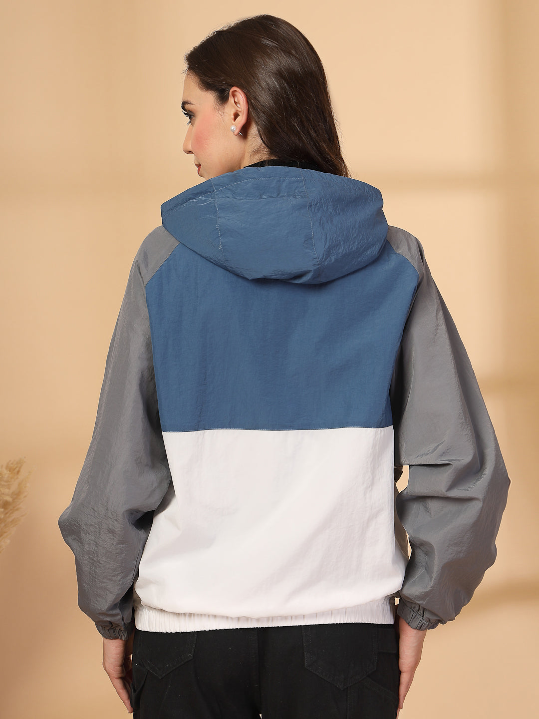 Women Colourblocked Hooded Windcheater Oversized Sports Jacket