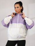 Women Colourblocked Hooded Windcheater Oversized Sports Jacket Lavender White