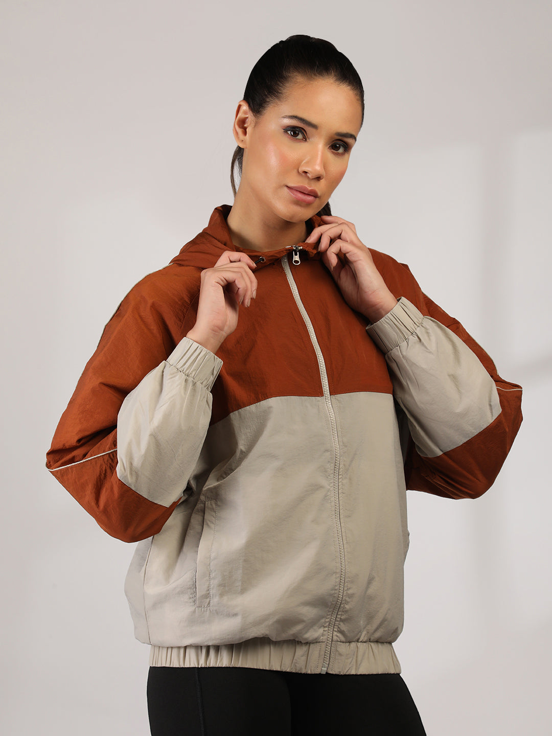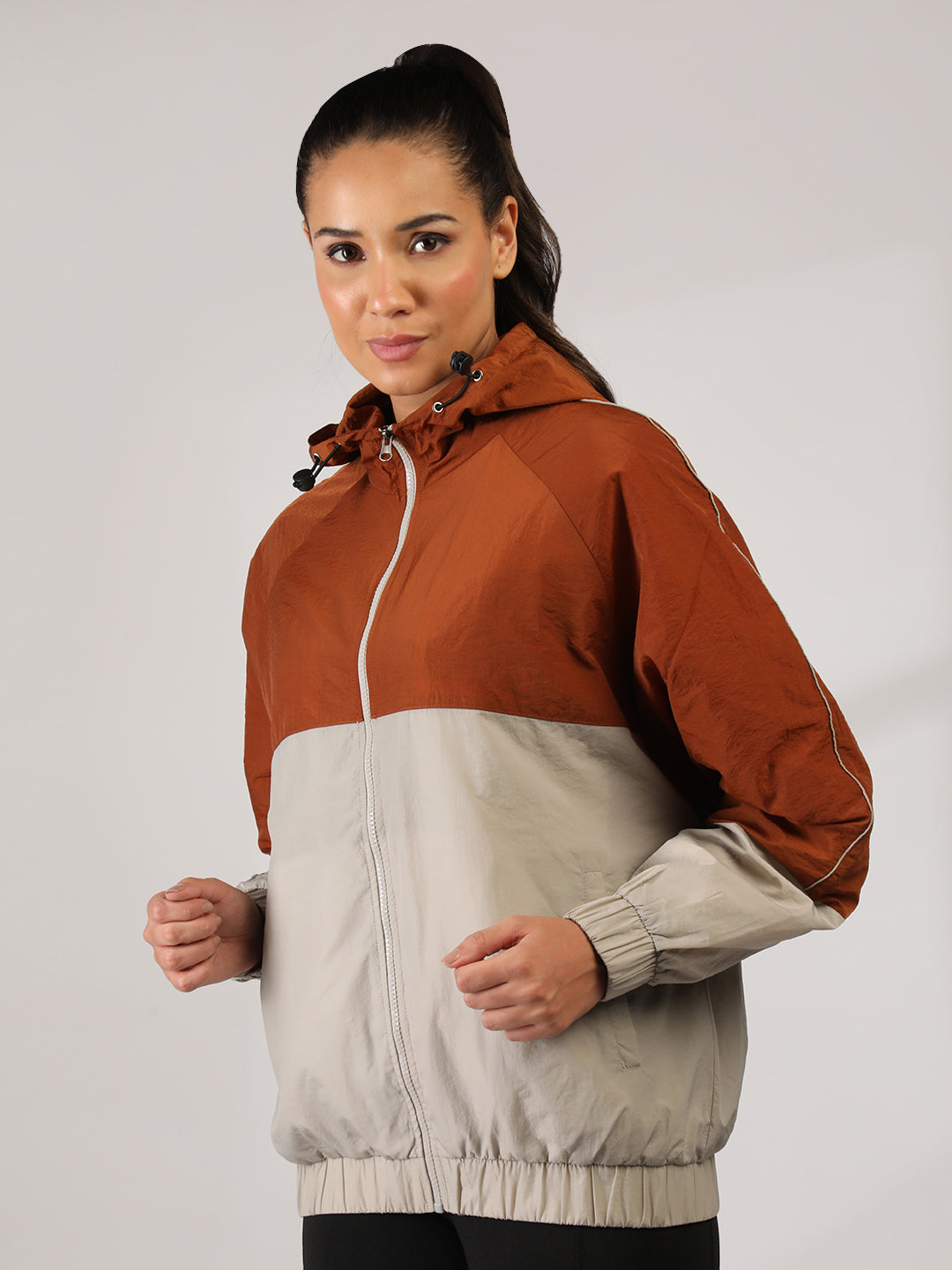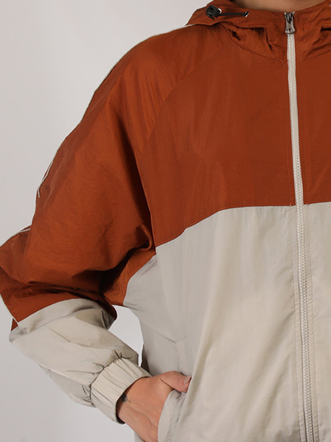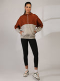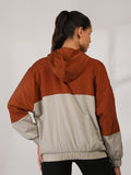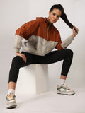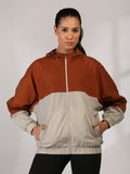 Women Colourblocked Hooded Windcheater Oversized Sports Jacket Rust Sand